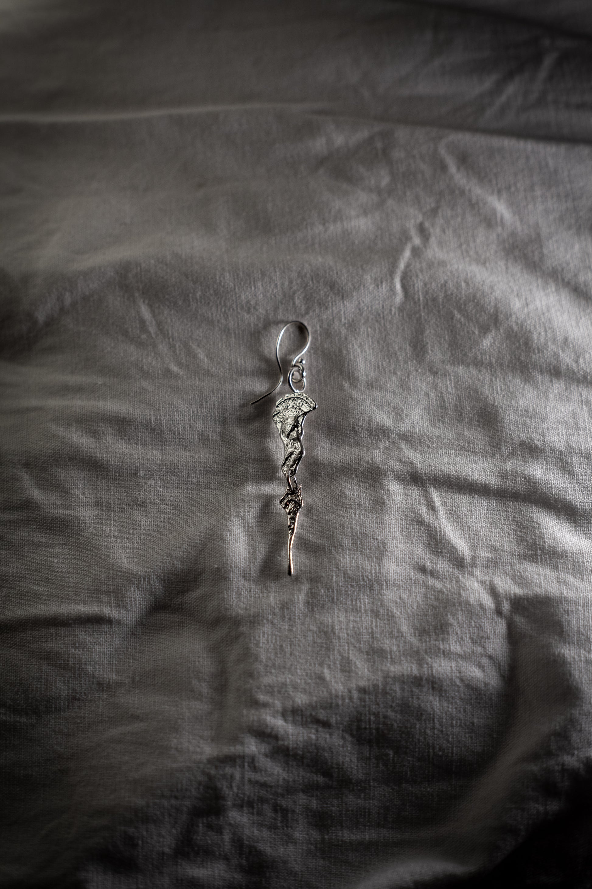 singular silver earring made from two half casts. sometimes the silver doesn’t fully seep into all the crevices and I love keeping the results. it’s like a physical showing of that process in an earring. i love it