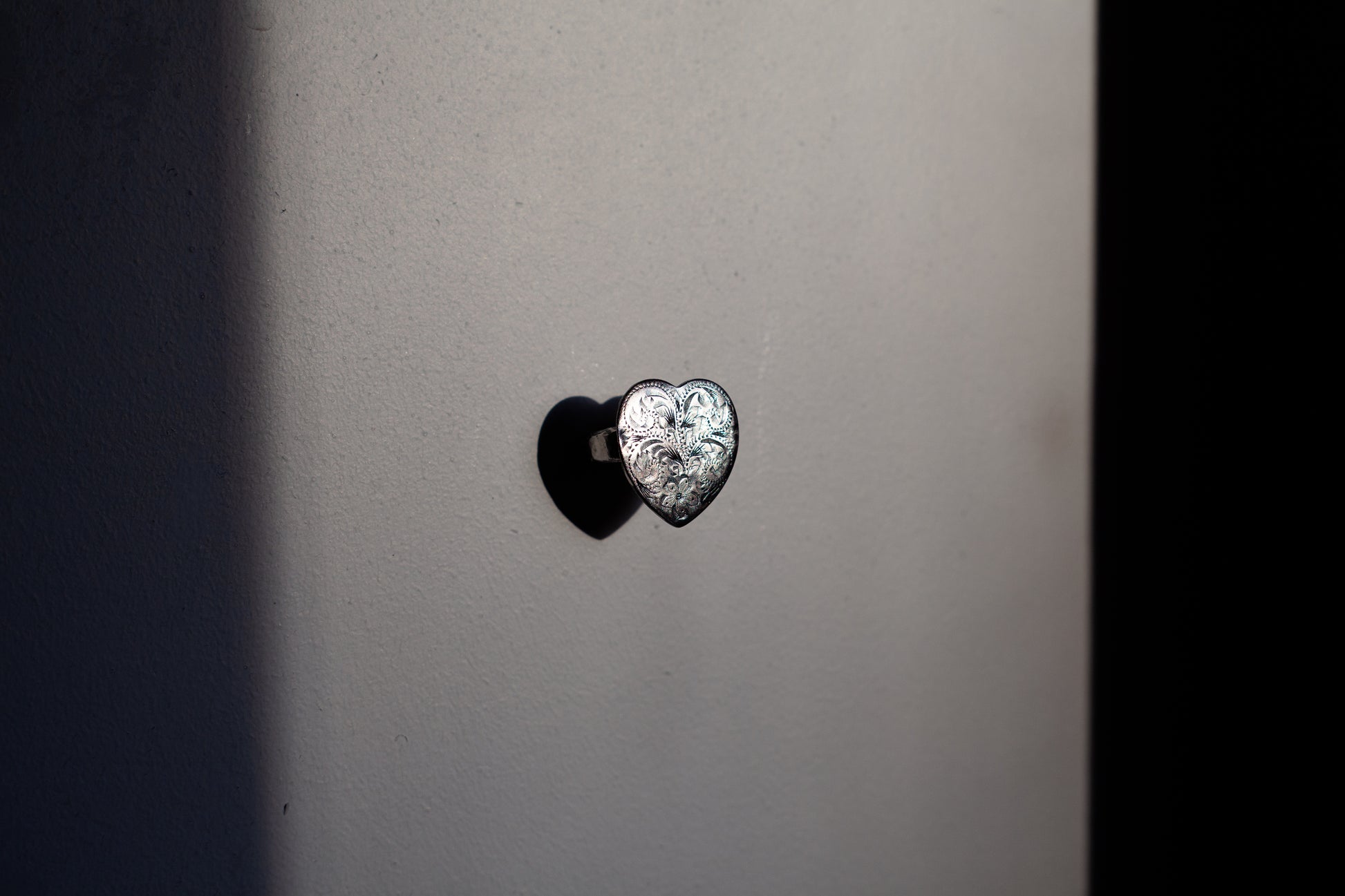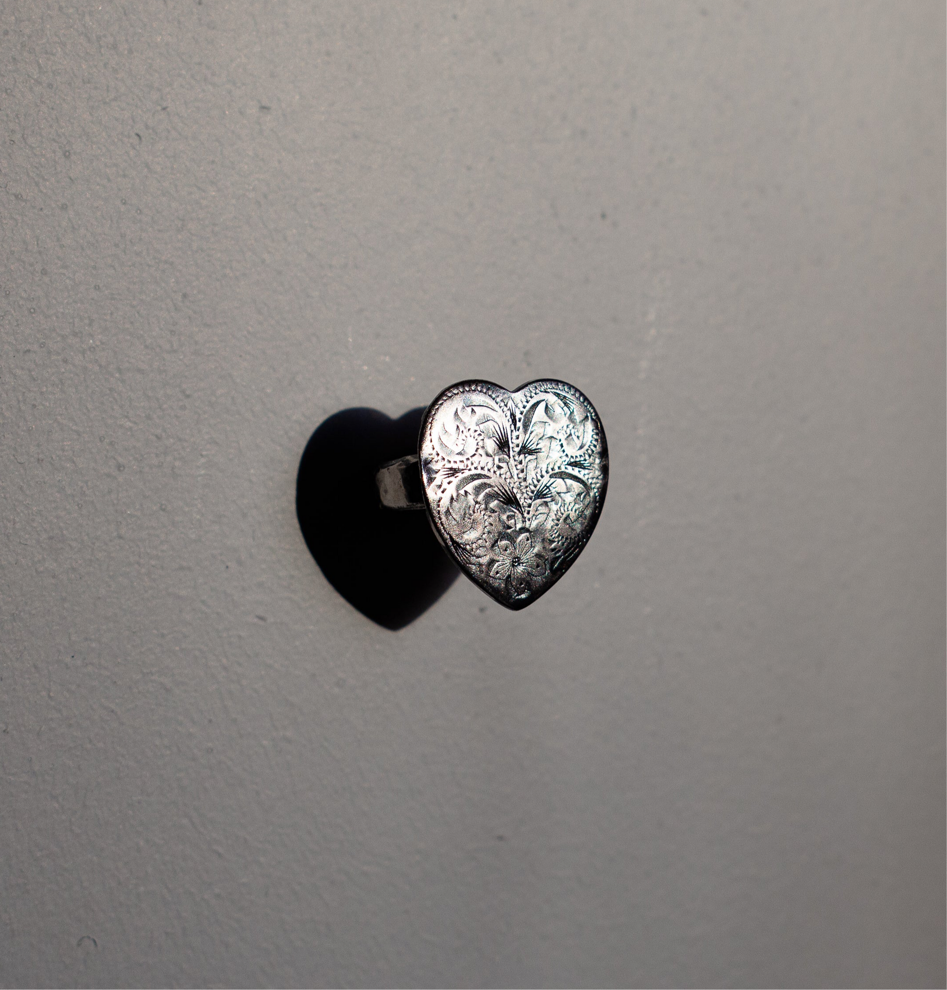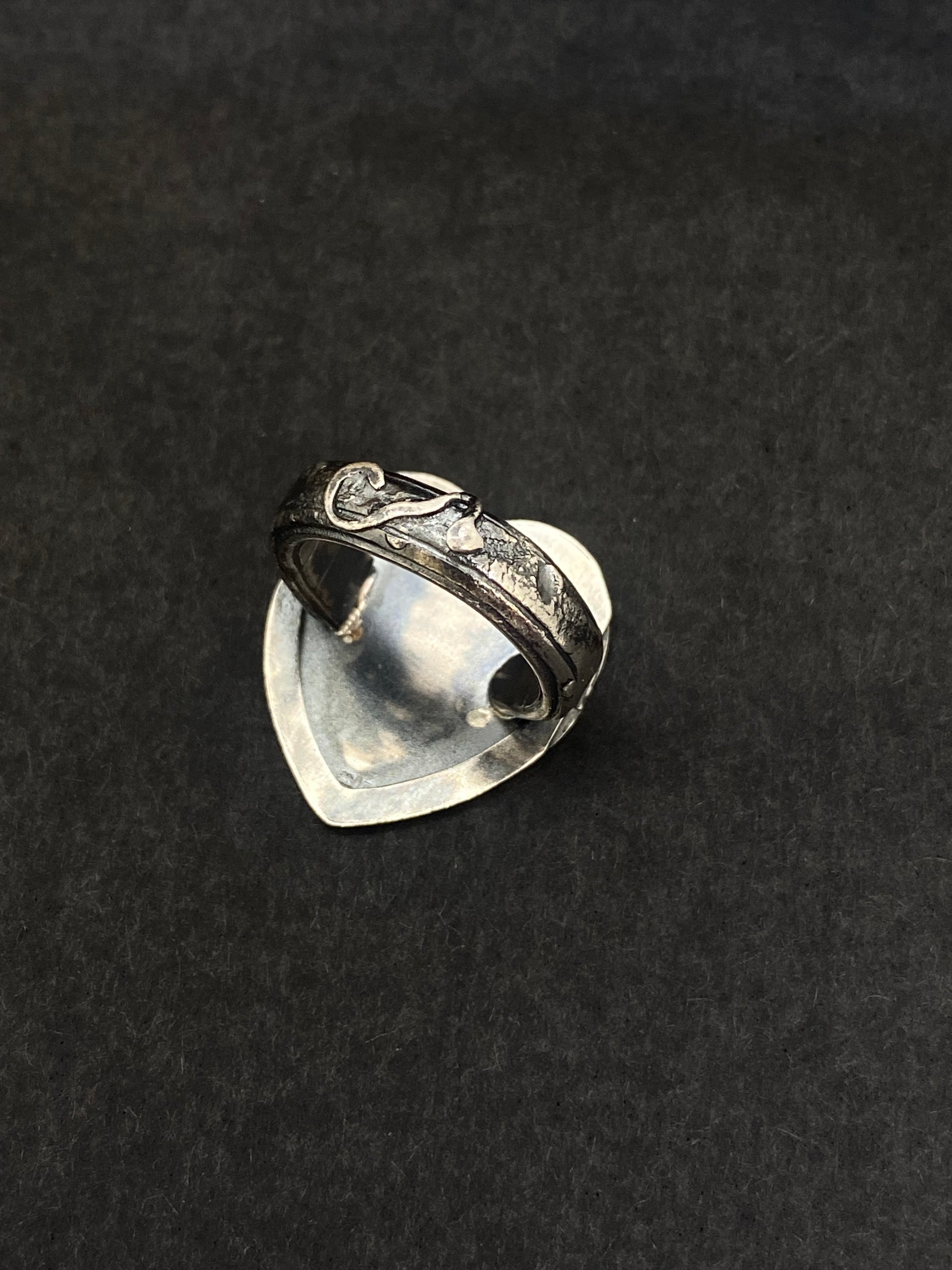 size J. silver heart ring made from a delicately engraved broken locket. thick band created through fusing and hammering.