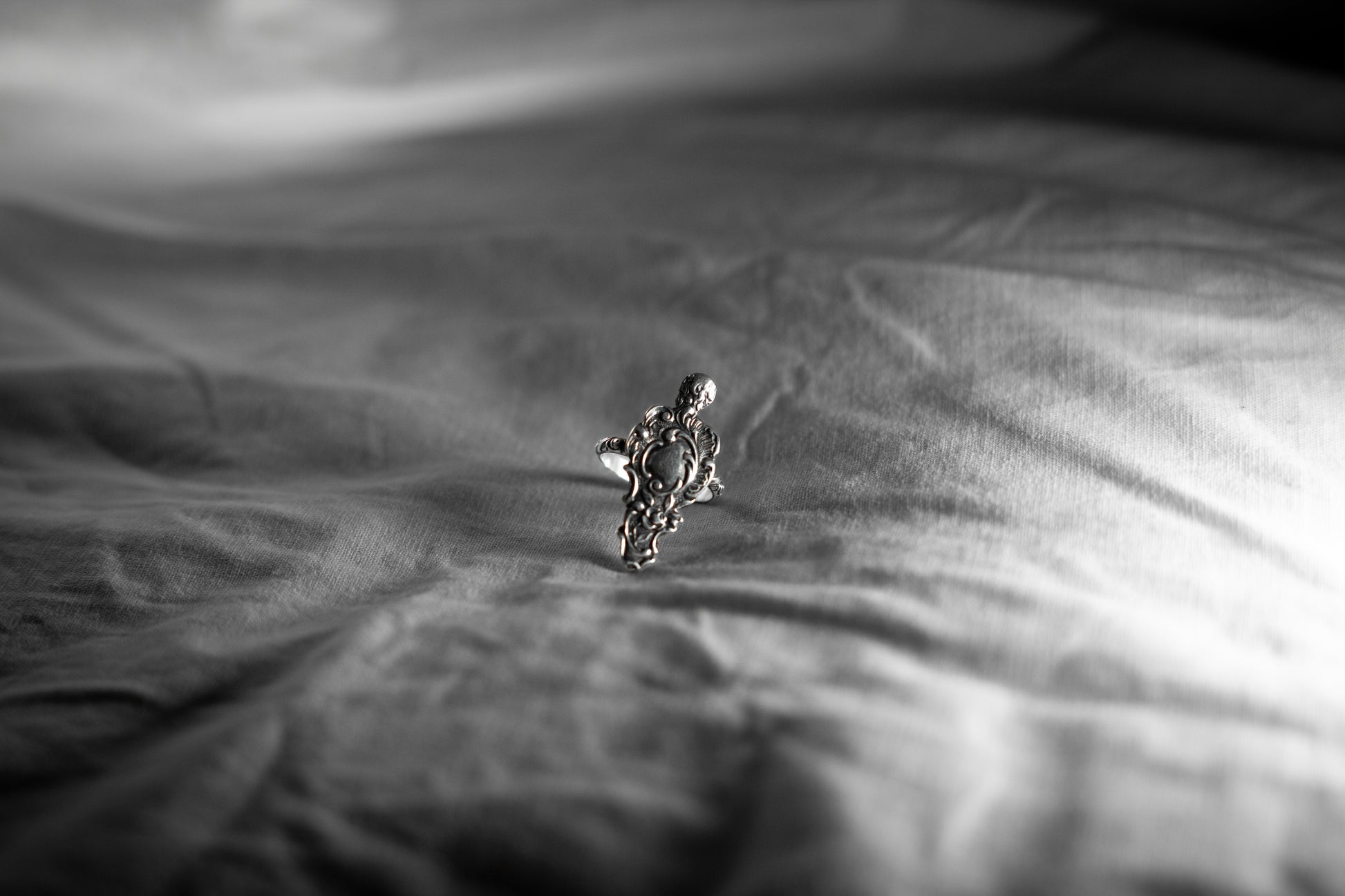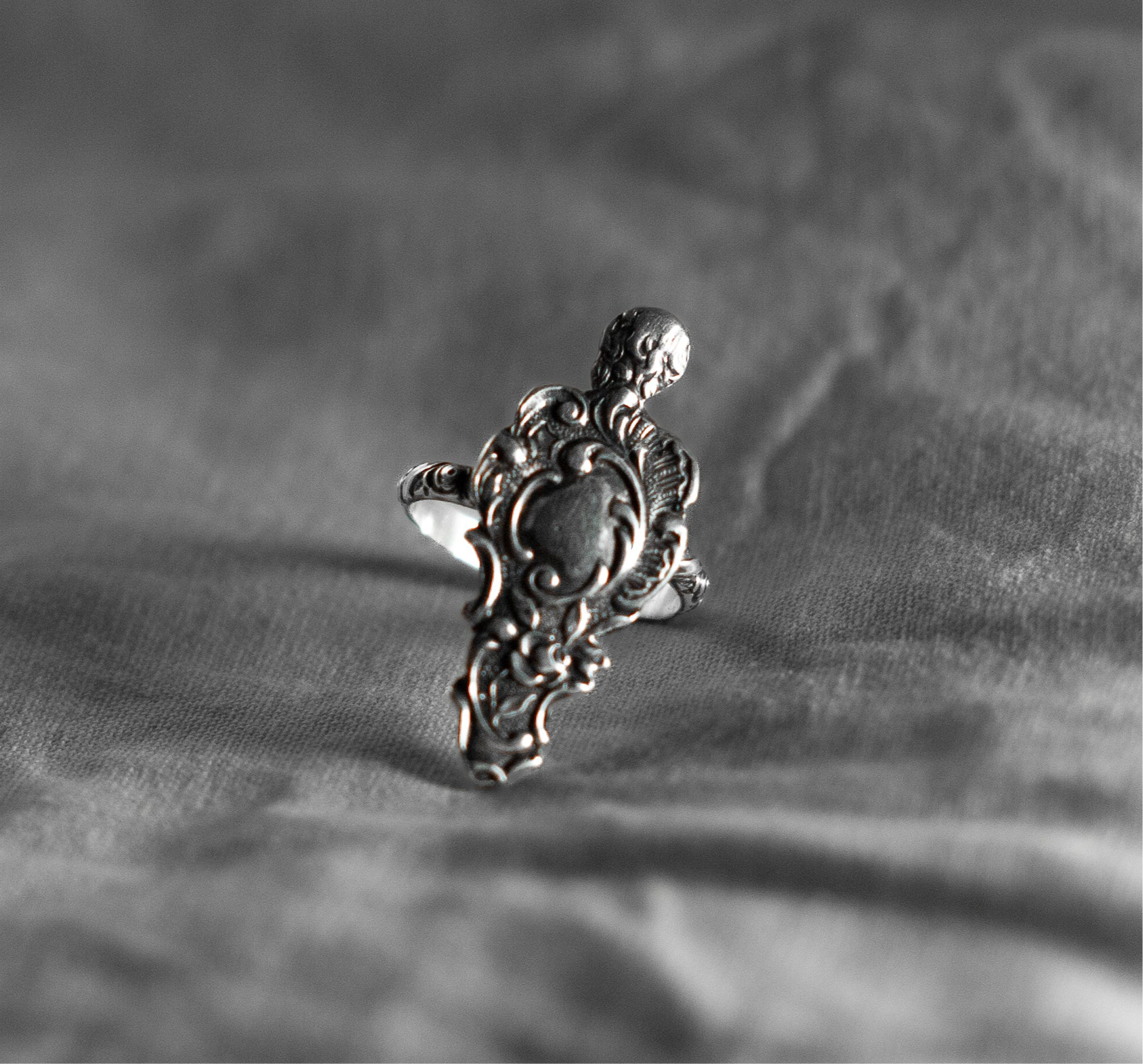 size N 1/2. oxidised cherub ring made from a victorian spoon. the cherub front is on the inside of this ring, which I also have made the inverse of (see ‘cherub of the light ring’). the same spoons were made for the pendants on my shop. It’s like silver collage. i think i like the back more than the front. the cherub is turned away. staring into the depths of your finger. maybe clinging on. poor cherub.